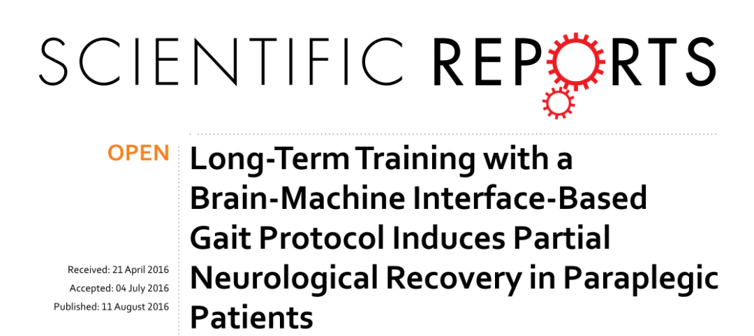 1. Ana R. C. Donati, Solaiman Shokur1,Edgard Morya, Debora S. F. Campos etal. Long-Term Training with a Brain-MachineInterface-Based Gait Protocol Induces Partial Neurological Recovery inParaplegic Patients . SCIENTIFIC REPORTS 2016 August 11. doi: 10.1038/srep30383.