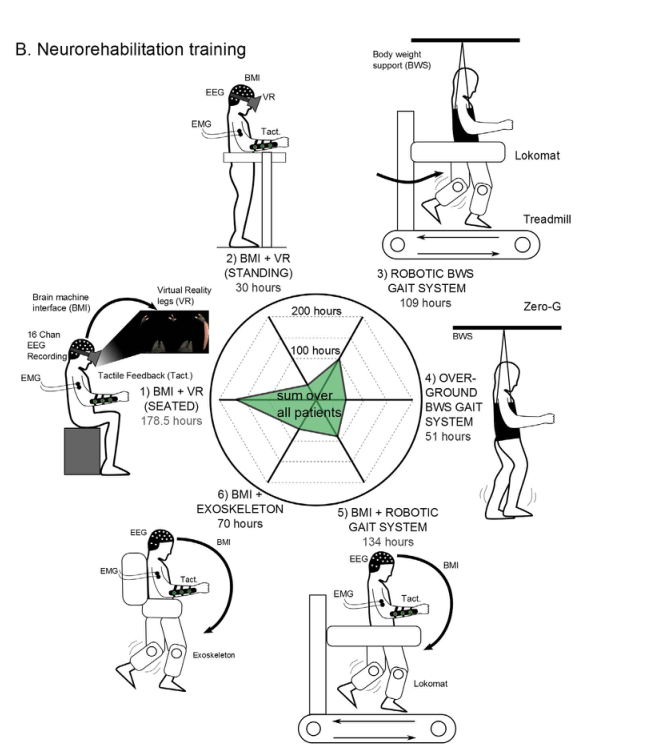 經(jīng)過12個月的訓練,8名患者在軀體感覺(疼痛定位、精細/粗糙觸摸和本體感覺)方面都有神經(jīng)性改善。根據(jù)肌電圖的測量,患者在SCI水平以下的關鍵肌肉中也恢復了自主運動控制,從而顯著改善了他們的步行指數(shù)。還有50%的患者升級為不完全截癱分類。作者假設這種前所未有的神經(jīng)恢復是因為長期使用BMI激活了皮質層和脊髓的可塑性。但是作者也強調(diào),沒有研究表明長期的BMI訓練可以誘導任何類型的臨床康復。