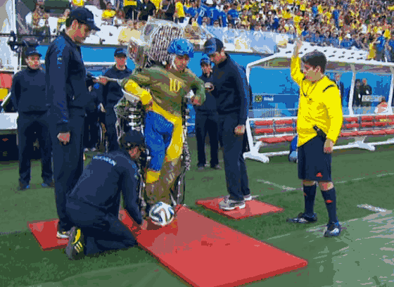 脊髓作為中樞神經(jīng)和外周神經(jīng)的橋梁,無論是這幾年大熱的腦機接口聯(lián)合外骨骼機器人或減重步行機進行步行訓練,還是植入硬膜外電刺激,試驗結果表明,在一定程度上都能改善患者的感覺功能或者是運動功能。包括脊髓完全性損傷的患者也能在特殊情況下,通過強化訓練和電刺激恢復行走、站立和軀干的活動能力。還記得2014年巴西世界杯開幕式上那精彩一幕嗎?癱瘓的青年利亞諾·平托應用腦機雙向接口系統(tǒng),經(jīng)過虛擬行走、踢球的訓練后,學會了通過外骨骼控制運動。穿著龐大的外骨骼踢出了當年世界杯的第一球。