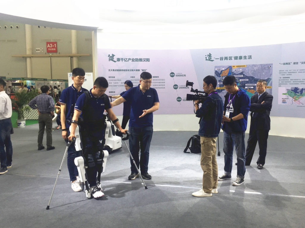 圖為武漢市長周先旺駐足了解悠行下肢外骨骼機器人