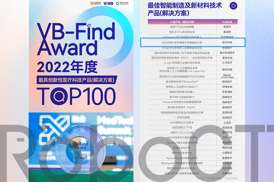近日,2022醫療科技世界峰會于蘇州召開。盛會上,榜單組正式對外發布 VB-Find Award:2022年度最具創新性醫療科技產品(解決方案)TOP100。程天科技「交互式悠行系列康復外骨骼產品解決方案」入選最佳智能制造及新材料技術產品榜單。