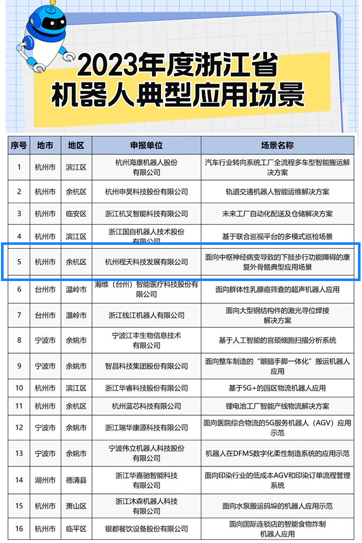 近日,根據《關于組織召開機器人典型應用場景和“機器人+”應用標桿企業評審會的通知》,2023年度浙江省機器人典型應用場景和 “機器人+”應用標桿企業名單公布。程天科技「面向中樞神經病變導致的下肢步行功能障礙的康復外骨骼典型應用場景」獲評2023年度浙江省機器人典型應用場景。