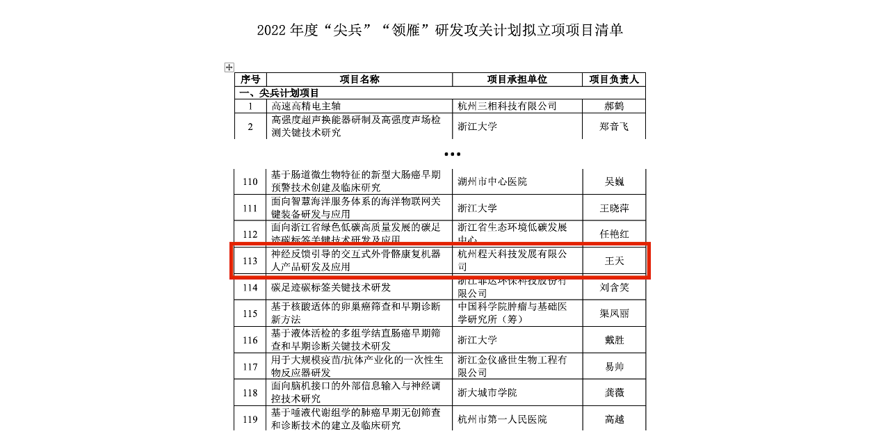 浙江省科學技術廳關于2022年度“尖兵”“領雁”研發攻關計劃項目立項已完成公示。程天科技牽頭申報的“神經反饋引導的交互式外骨骼康復機器人產品研發及應用”,連同省內其他119個項目獲得“尖兵計劃”省重點研發專項,共同支撐浙江高水平創新型省份和科技強省建設,充分發揮科技創新在高質量發展建設共同富裕示范區中的引領作用。據悉,該項目聯合浙江省內知名高校、研究院所和臨床醫院協同完成申報,有效整合企業和多方多領域資源,共同推進外骨骼康復機器人行業發展。
