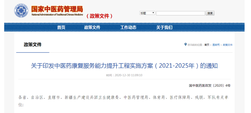 2020年12月29日,國家醫(yī)政醫(yī)管局印發(fā)《關(guān)于加強老年人居家醫(yī)療服務(wù)工作的通知》,文件指出,需加強老年患者診療服務(wù)、醫(yī)療護理、康復(fù)治療等上門醫(yī)療服務(wù),重點是二級及以下醫(yī)院、基層醫(yī)療衛(wèi)生機構(gòu)等。12月30日,國家衛(wèi)生健康委員會、國家中醫(yī)藥管理等6部門于聯(lián)合印發(fā)《關(guān)于印發(fā)中醫(yī)藥康復(fù)服務(wù)能力提升工程實施方案(2021-2025年)的通知》,旨在擴大基層醫(yī)療機構(gòu)中醫(yī)藥康復(fù)服務(wù)范圍,推廣應(yīng)用中醫(yī)藥技術(shù)方法,推動中醫(yī)康復(fù)進社區(qū)、進農(nóng)村、進家庭。在養(yǎng)老、護理機構(gòu)中提供中醫(yī)藥特色康復(fù)服務(wù)。